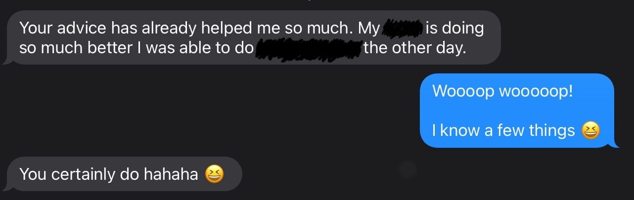 Once I had a good picture of what was going on, we made a few tweaks to their rehab. Suggested a few exercises to add to their daily routine, limitations and better progressions.
