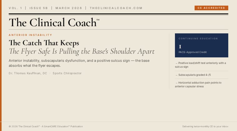 The Clinical Coach™ delivers evidence-based continuing education for chiropractors and physical therapists focused on sports medicine, muscle and joint pain, and musculoskeletal rehabilitation. Each biweekly edition provides PACE-approved CE credits (1 credit hour) with immediately applicable clinical protocols.